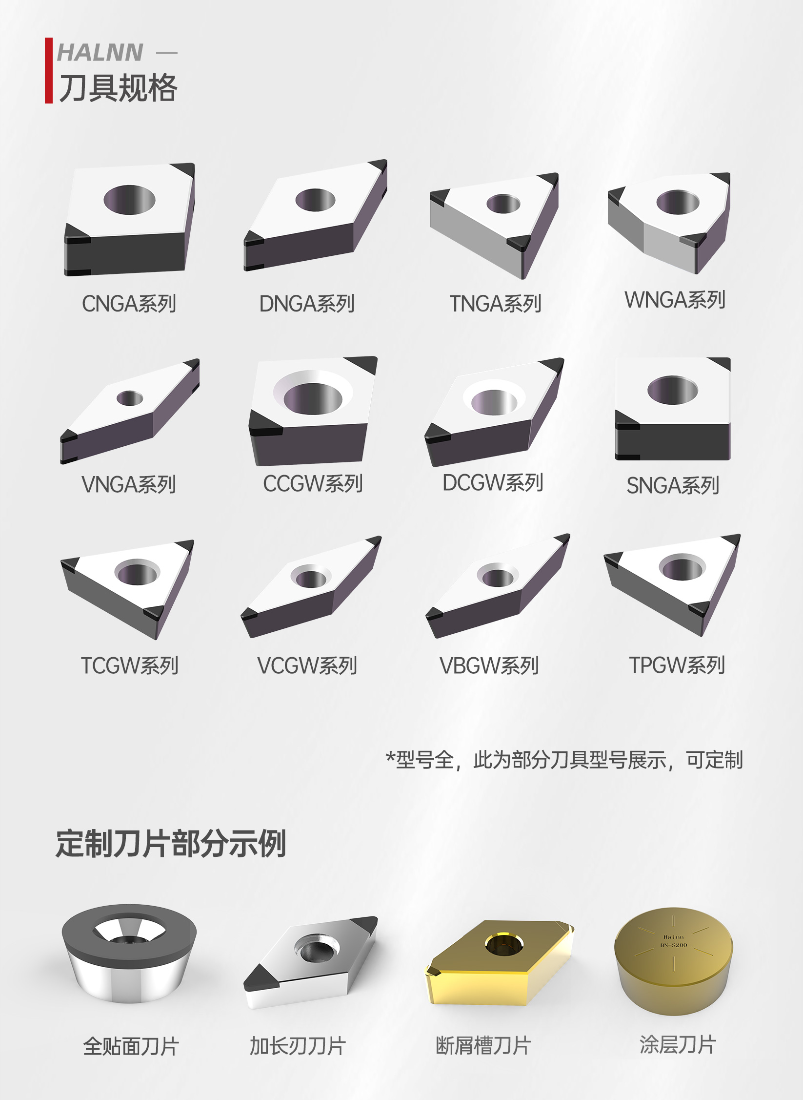 華菱超硬提供了多種硬車削CBN刀具規格,包括CNGA系列、VNGA系列、TCGW系列等,以滿足不同客戶的需求。此外,公司還提供定制刀片服務,包括全貼面刀片、加長刃刀片、斷屑槽刀片和涂層刀片等,以適應各種復雜的加工環境。